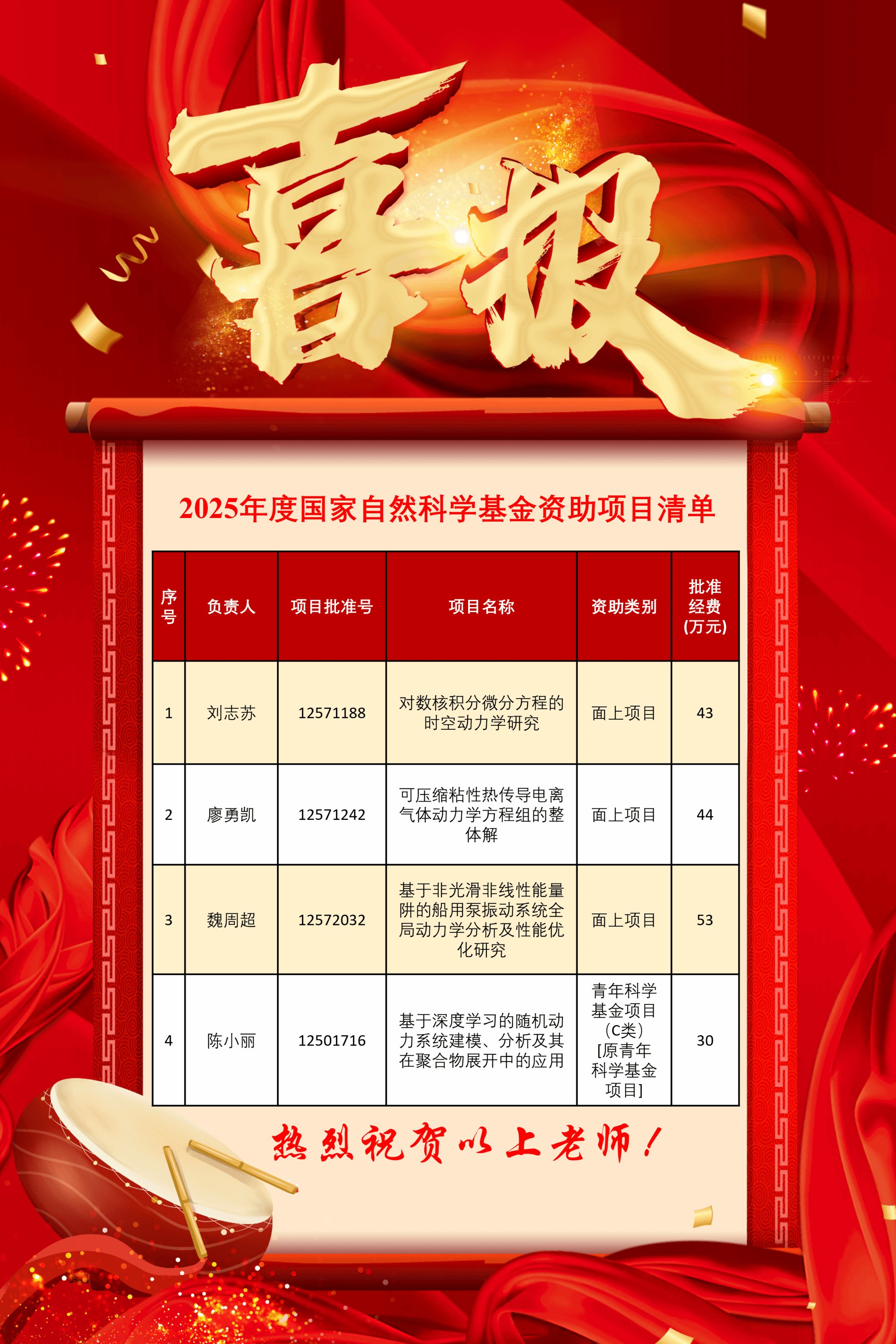 2025年8月27日,国家自然科学基金委员会公布了2025年集中接收期项目评审结果,91网 共有4项项目获得立项资助,其中面上项目3项、青年科学基金项目(C类)[原青年科学基金项目] 1项。