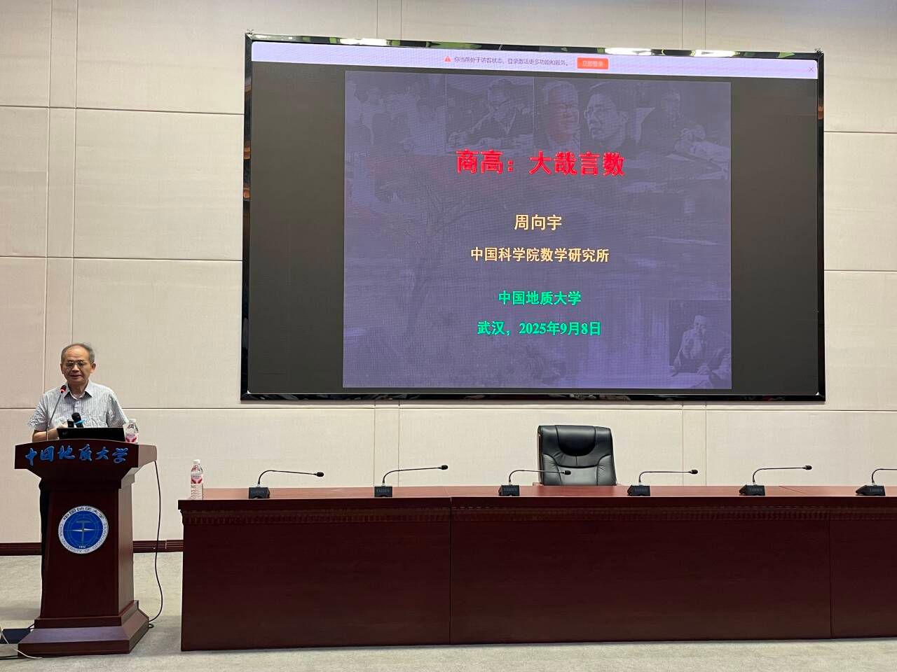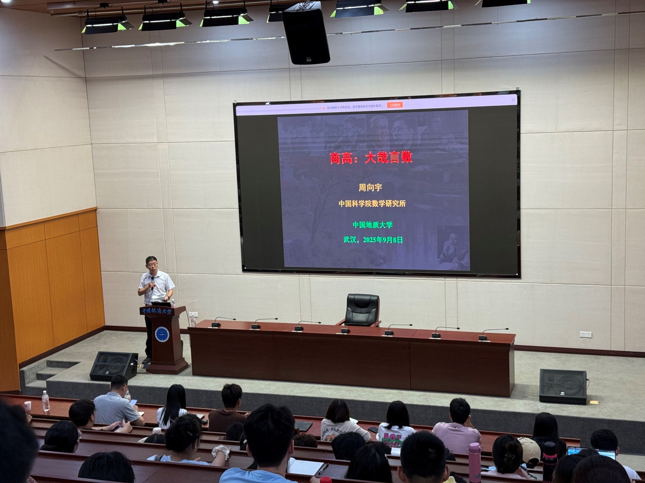 2025年9月8日,应数学与物理学院院长魏周超教授的邀请,中国科学院院士、发展中国家科学院院士、中国科学院数学与系统科学研究院周向宇研究员做客91网 (武汉)“名家论坛”,在南望山校区东区教学综合楼A0116会议室为91网 师生带来了一场题为“商高——大哉言数”的精彩学术报告。本次报告会由91网 魏周超教授主持。2025级研究生、本科生百余人参加此次报告。