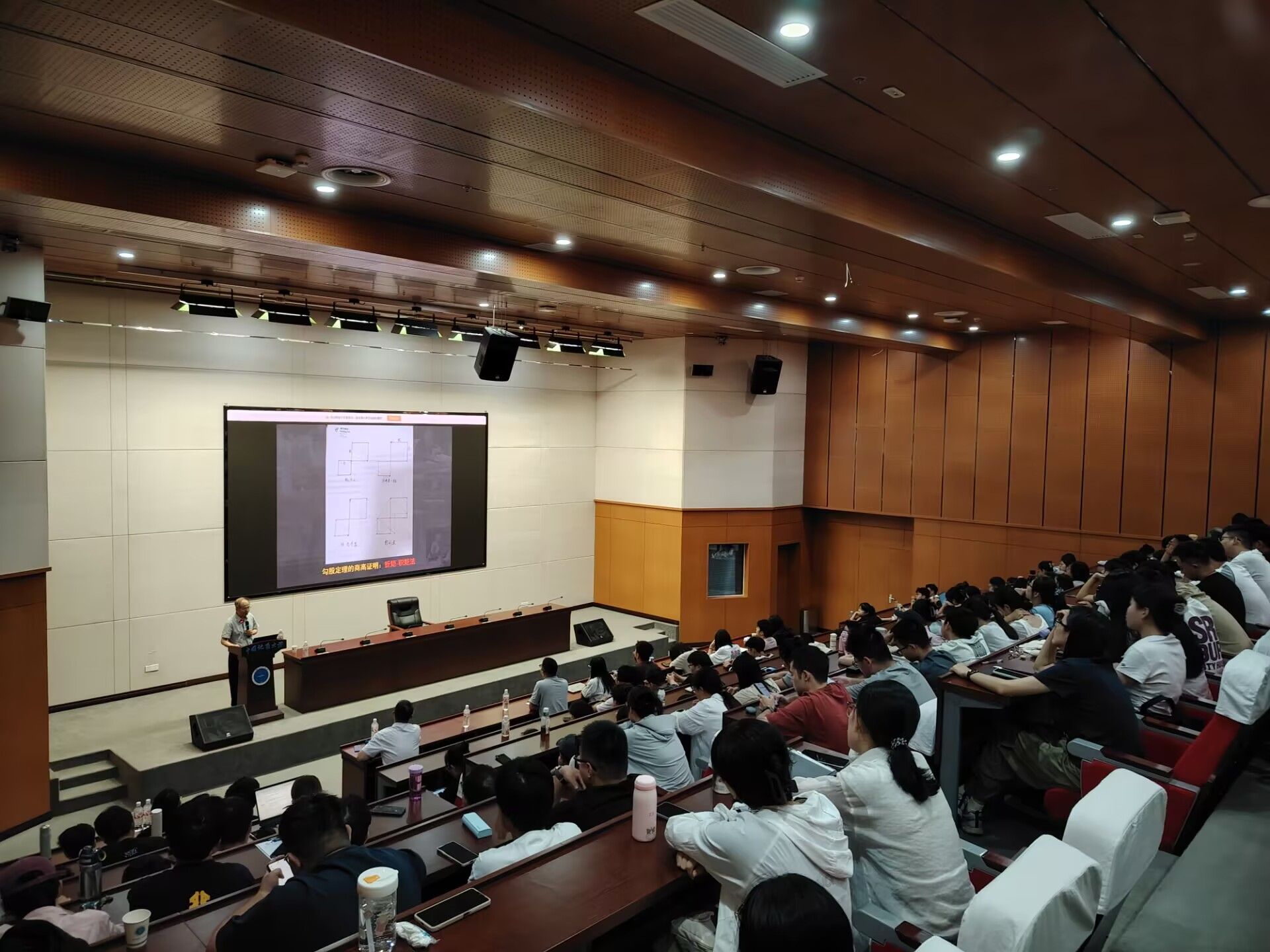 讲座尾声,周院士简要介绍了古代数学在多个现代数学分支中的影响与贡献,鼓励在场师生学习我国先贤的钻研求索精神,同时也简单介绍了其团队在多复变函数论领域取得的最新研究进展,以及在复代数几何、复微分几何等相关领域产生的应用价值与学术影响,指出与商高等古圣先贤思想也可互相印证,让师生们对中国古代数学中所蕴含的独特智慧、以及和前沿数学研究的联系有了更为直观的认识。