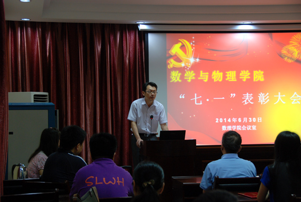 表彰大会在雄壮的国歌声中拉开帷幕,受党组织委托,李杰宣读了《数学与物理学院“七一”表彰决定》。刘治国为获得2013-2014年度校级先进基层党组织、优秀党员和优秀党务工作者颁奖,李宇凯为获得院级先进学生党支部和优秀学生党员颁奖。