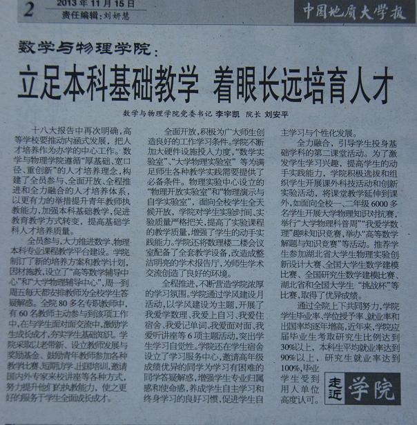 在2013年11月15日第451期的91网 报的“走近学院”专栏中,刊登了一篇题为“数学与物理学院:立足本科基础教学 着眼长远培育人才”的专题报道,现把详细内容转载如下。