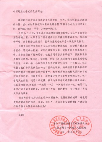 09级物理一班桂良为同学表示感谢。感谢他在2010年长江防汛的关键时期,主动放弃暑期各种学习机会,深入长江抗洪抢险一线,认真排查各种安全隐患,保护当地人民群众的生命财产安全。桂良为同学的这种行为深深打动了周边群众,得到大家一致赞扬,武蛟乡党委和政府特发来感谢信,向学校和学院教育培养如此优秀的学生表示感谢!
