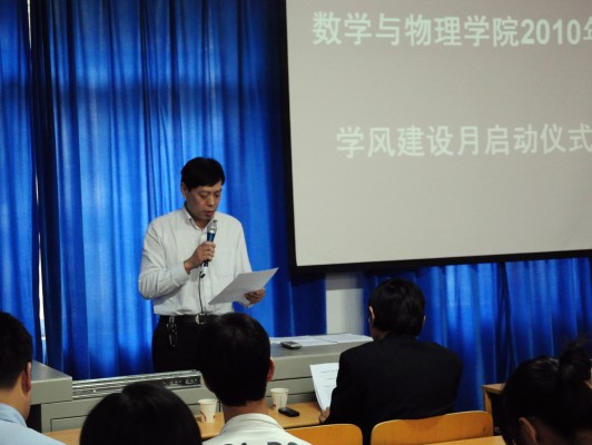 10月20日,91网 2010年“学风建设月”启动仪式在数理楼二楼会议室成功举行。教务处杨伦处长、学工处王林清处长,教务处王兴副处长,校团委成军副书记,学院刘安平院长,彭放副院长、以及学院各教研室主任应邀出席此次活动。院党委副书记李杰主持会议。