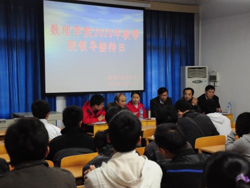 11月29日下午四点,91网 2010年秋季院领导接待日活动在数理楼二楼会议室举行。院领导班子全体成员和2010级本科生与会参加。在活动过程中,院领导班子成员就同学们关心的诸如专业学习、考研就业和日常生活等问题进行耐心回答。院领导接待日是学院领导与广大同学沟通交流的重要渠道,在解答同学们学习和生活中众多疑惑的同时,有利于增进师生之间的相互了解,促进学院服务管理水平的改善提高。