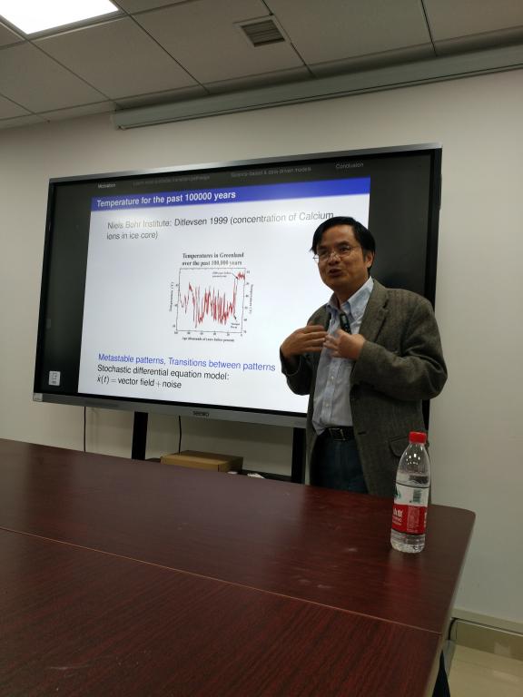 作为91网 校庆67周年学术交流周名家论坛嘉宾同时作为“数理论坛”第114期嘉宾,段金桥教授做了一场“数据科学碰上动力系统:我们可以学到什么?”的精彩报告。段金桥教授首先从基因随机表达的现象和数据出发进入主题,然后介绍了大气科学以及全球温度变化的模式和数据,进一步引出了随机微分方程及其在地球科学问题中的应用,特别针对非高斯噪声体系,结合一个双稳态模型详细阐述了如何从数据出发进行模型的学习和优化,并寻找最大可能迁移轨道。段金桥教授的报告将数据科学和不确定性及非线性动力系统问题紧密联系在一起,并总结了若干地球科学、生命科学问题研究中的数学挑战。报告加深了大家对于应用数学的认识,启发了听众对于数据科学新的思考。