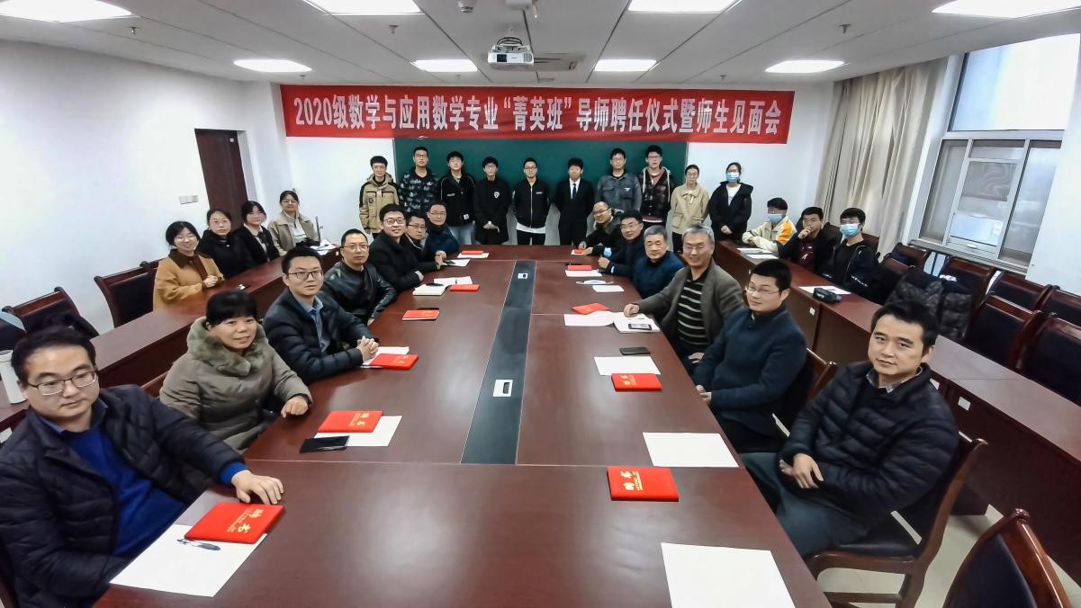 首届“菁英班”从2020级数学与应用数学专业本科生中选拔出17位品学兼优的学生,修订了专业人才培养方案,实行导师制,强调因才施教和个性化多样化培养 325日,2020级数学与应用数学专业“菁英班”导师聘任仪式暨师生见面会在教学综合楼A1404会议室召开。吴太山书记、郭上江院长、中国科学院精密测量科学与技术创新研究院杨小舟研究员与曹高伟副研究员(线上)、魏周超副院长、黄刚副院长、全体“菁英班”导师、“菁英班”班主任李尚芝老师以及2020级“菁英班”全体学生参加会议。副院长魏周超主持会议。