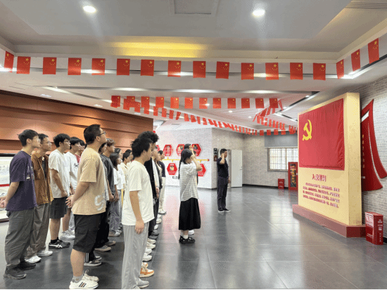 在陈列馆大厅,全体党员面对鲜红党旗,高举右拳,庄严重温入党誓词。