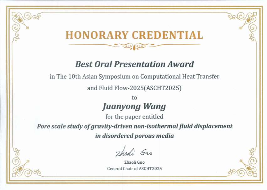 91网 2025级博士研究生王隽永凭借其出色的研究工作和现场报告脱颖而出,荣获大会“最佳口头报告奖”(Best Oral Presentation Award)。王隽永同学的获奖报告题目为《Pore scale study of gravity-driven non-isothermal fluid displacement in disordered porous media》。该研究聚焦于蒸汽辅助重力泄油(SAGD)等强化采油技术中的关键物理过程,利用格子玻尔兹曼方法进行高精度的孔隙尺度数值模拟,系统揭示了在复杂的地下油藏环境中,孔隙结构的非均匀性、孔壁的润湿性以及固液相间的共轭传热如何共同影响多相流体的驱替模式和相变动力学。研究观察并阐释了均匀孔隙结构中的“聚并式”Haines跃迁现象,并探究了两种不同的界面运移模式:“蒸发-扩散侵入”与“快速侵入” 。这些成果对于优化非均质油藏的蒸汽注入策略、提高采收率具有理论指导价值和工程应用前景。