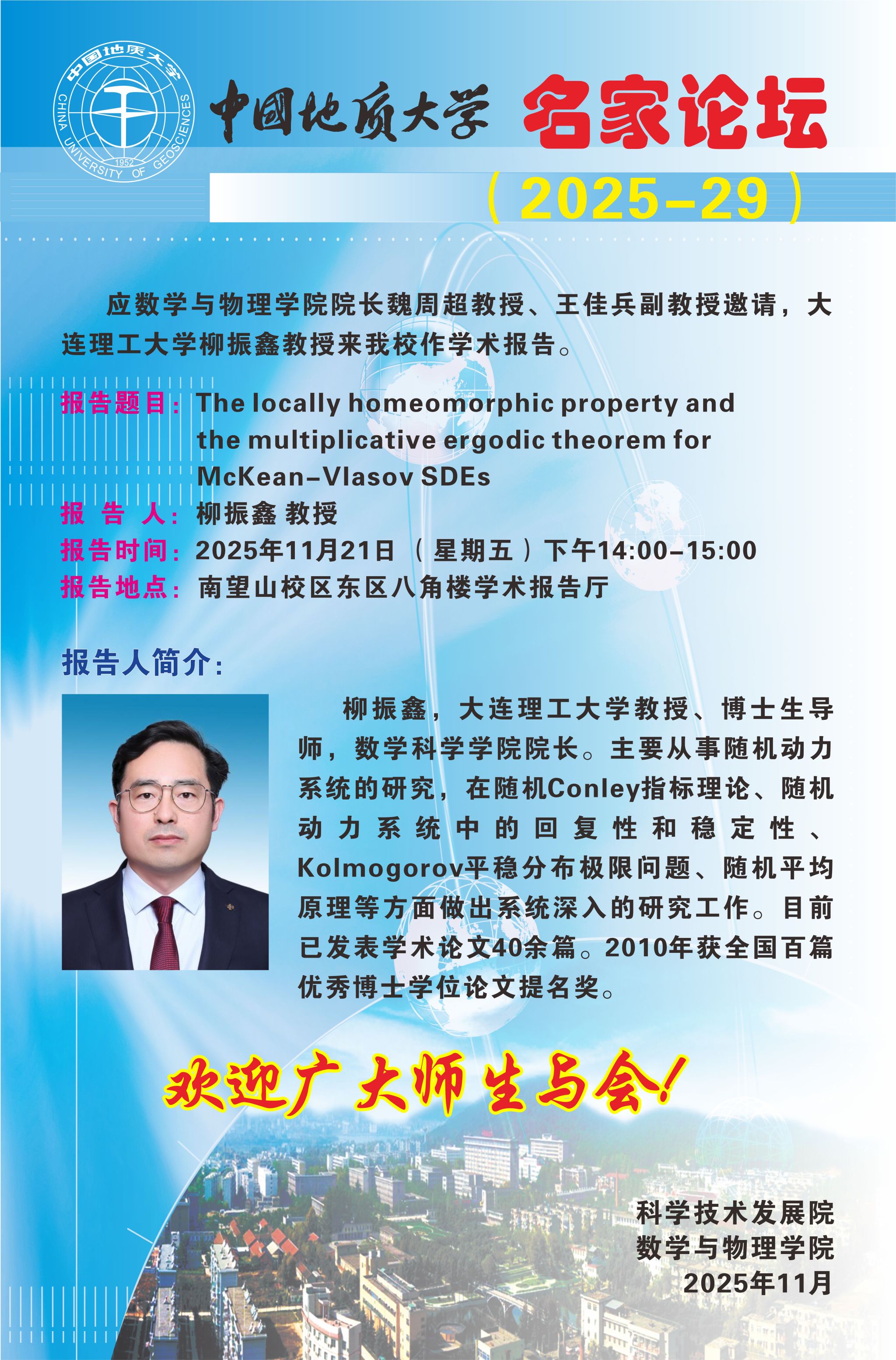 2025年11月21日柳振鑫教授学术讲座: The locally homeomorphic property and the multiplicative ergodic theorem for McKean-Vlasov SDEs