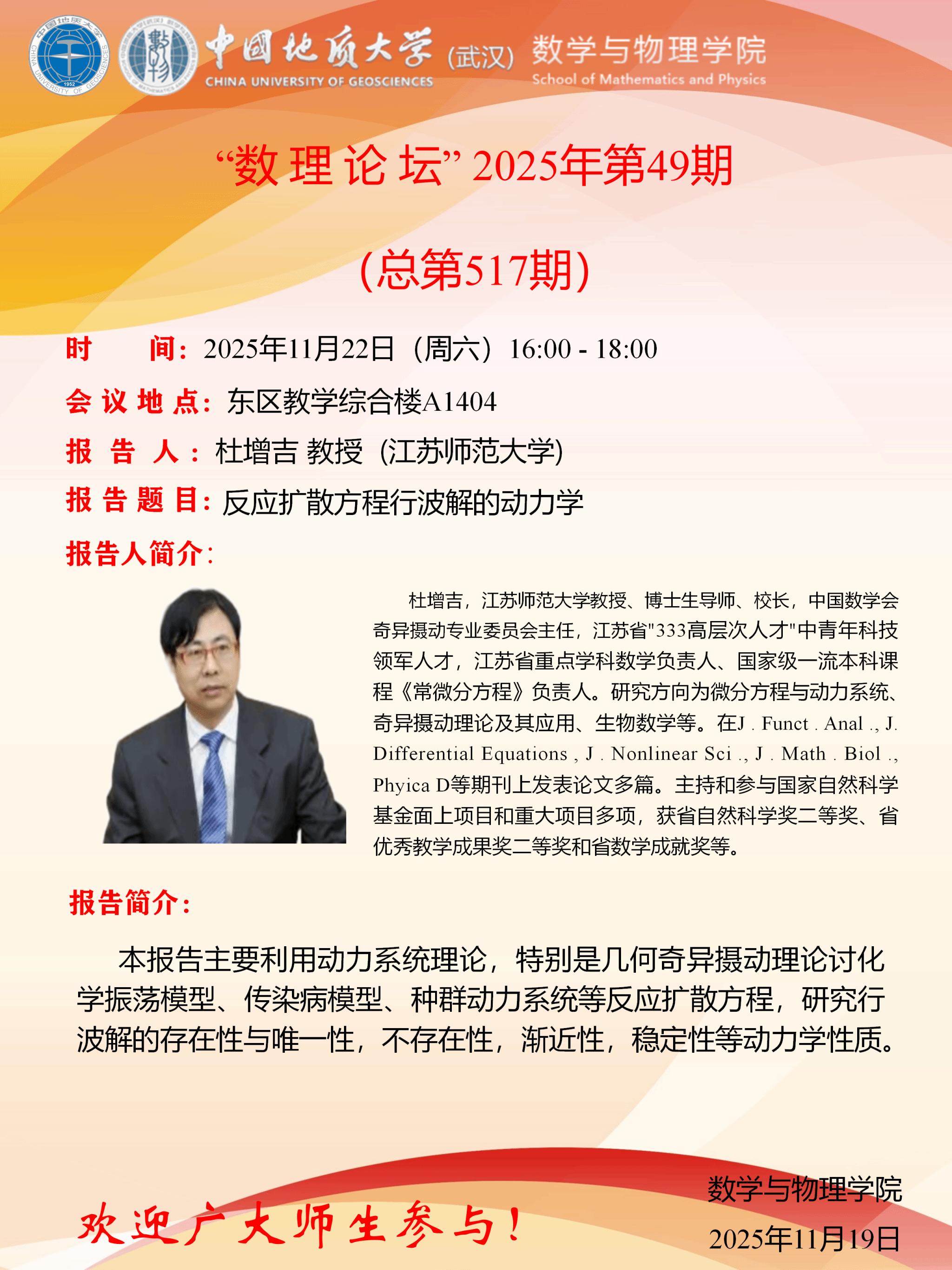 2025年11月22杜增吉教授学术讲座:反应扩散方程行波解的动力学
