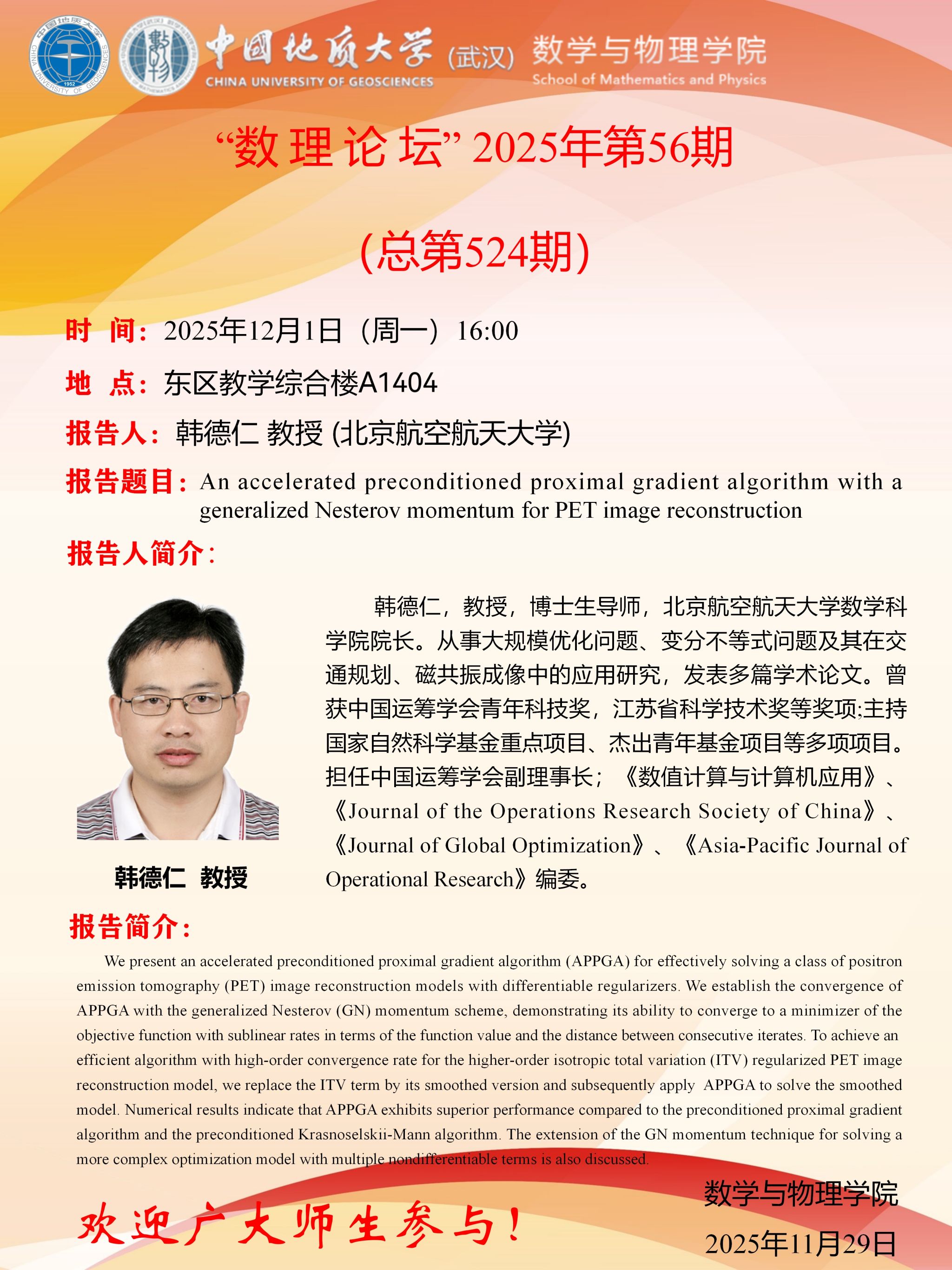 2025年12月1日韩德仁教授学术讲座:An accelerated preconditioned proximal gradient algorithm with a generalized Nesterov momentum for PET image reconstruction