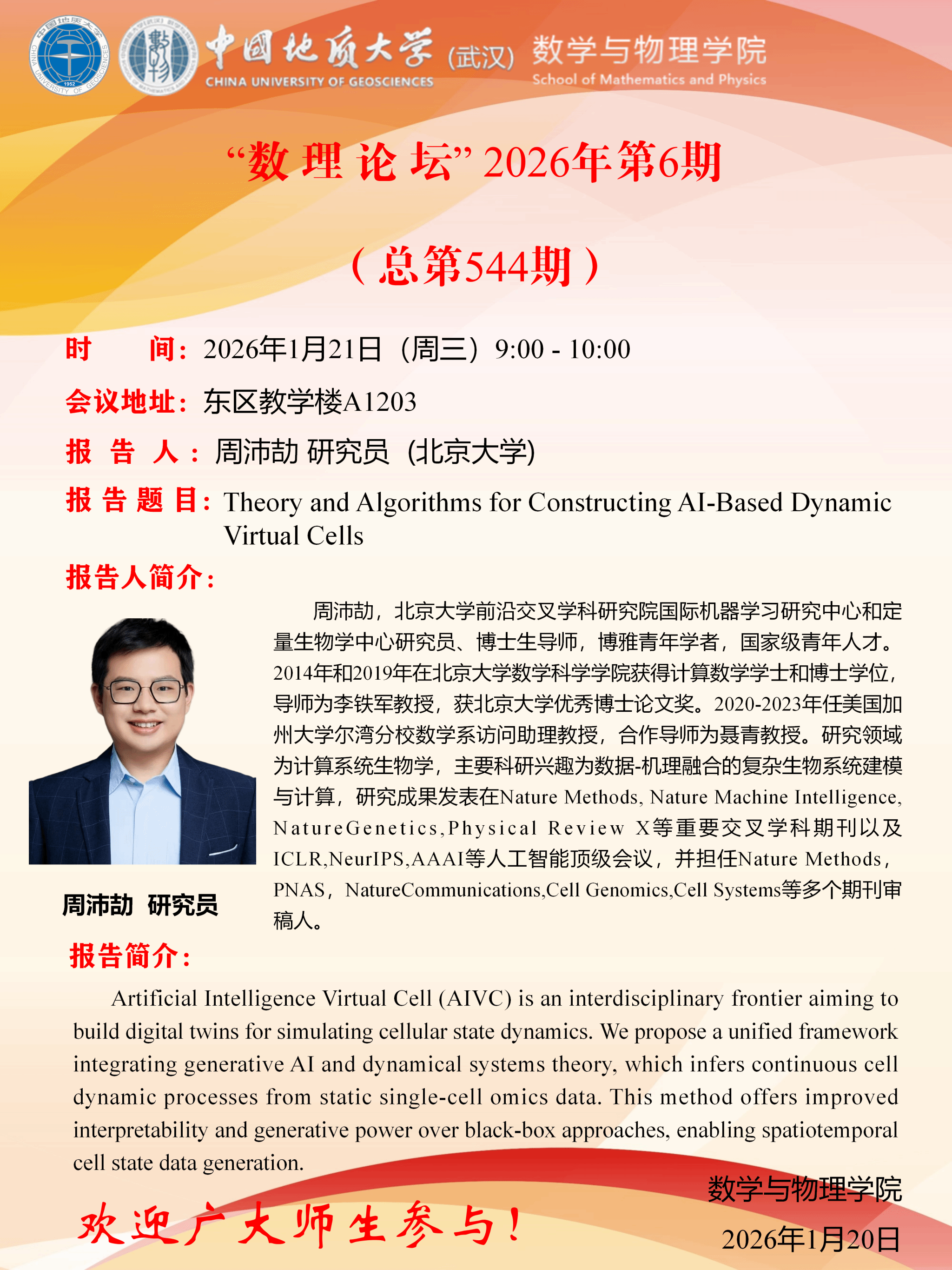 2026年1月21日周沛劼研究员学术讲座:Theory and Algorithms for Constructing Al-Based Dynamic Virtual Cells