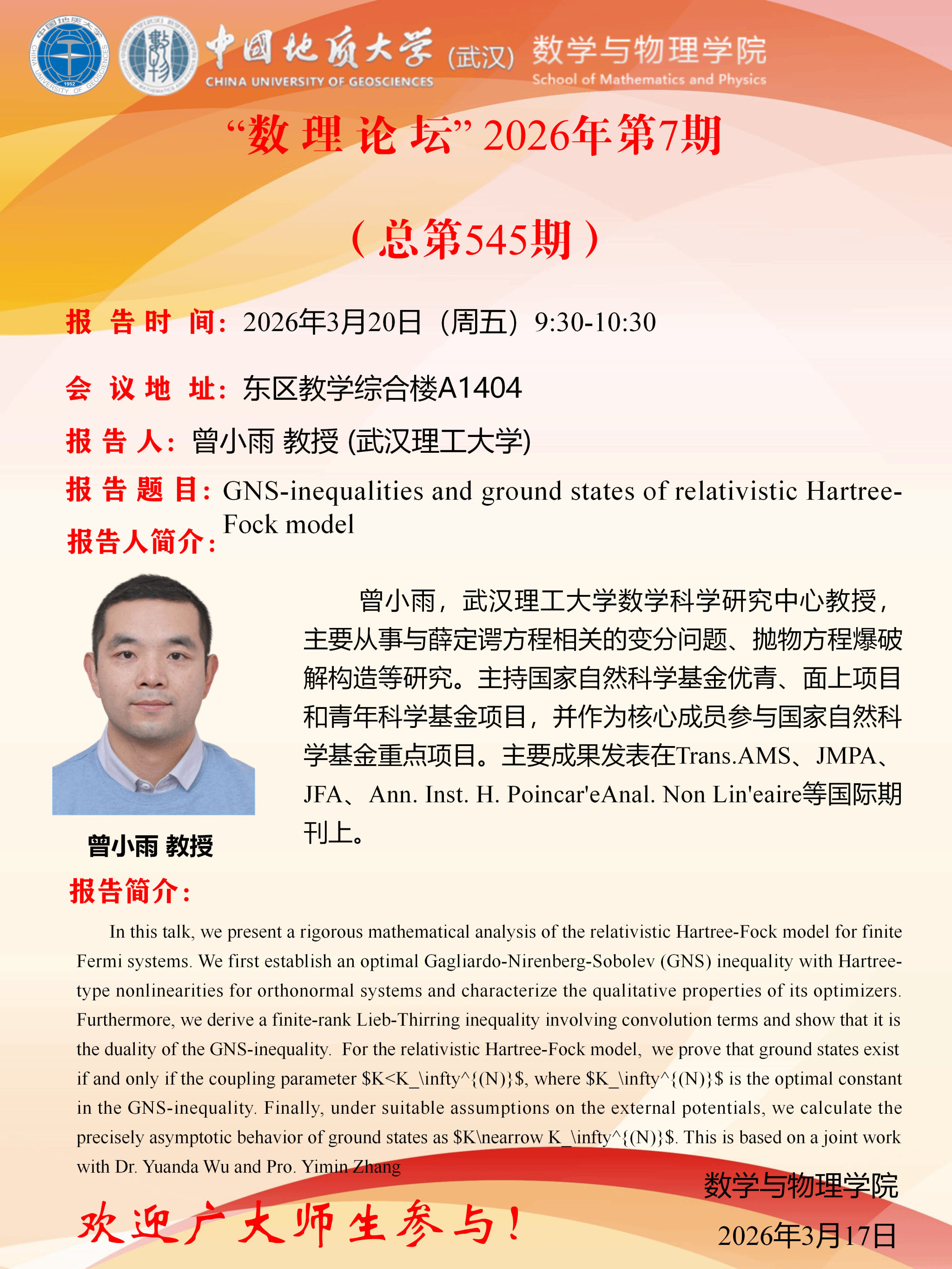 2026年3月20日曾小雨教授学术讲座:GNS-inequalities and ground states of relativistic Hartree-Fock model