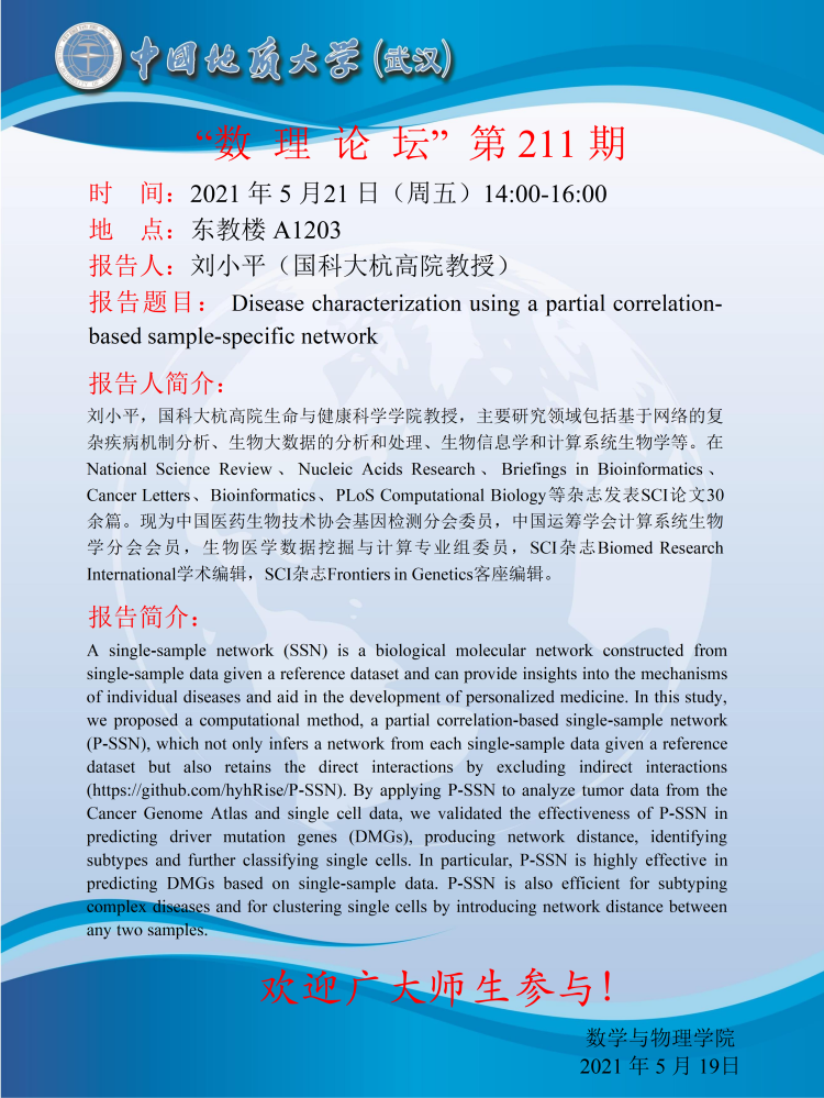 "数理论坛"第211期:Disease characterization using a partial correlation-based sample-specific network