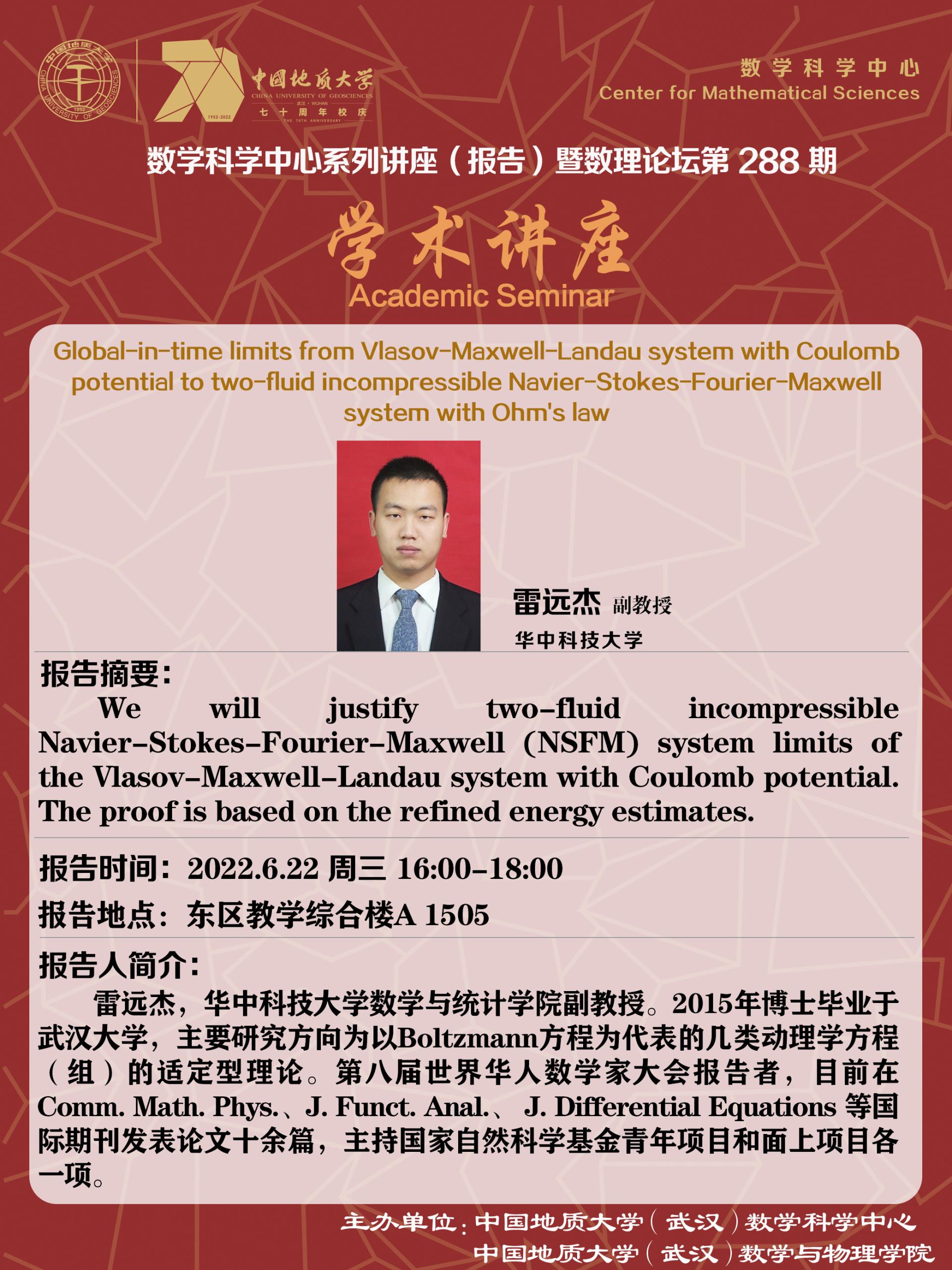 "数理论坛"第288期暨数学科学中心系列讲座(报告):Global-in-time limits from Vlasov-Maxwell-Landau system with Coulomb potential to two-fluid incompressible Navier-Stokes-Fourier-Maxwell system with Ohm's law