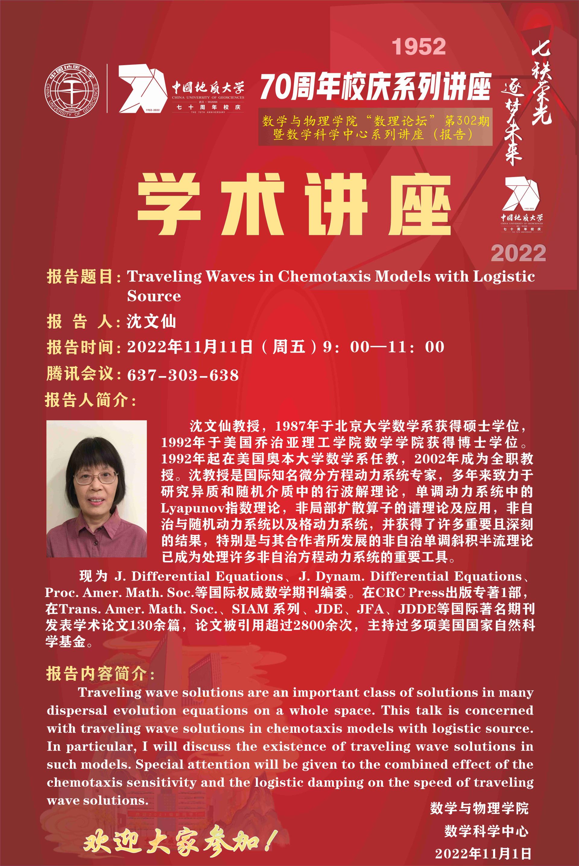 "数理论坛"第302期暨数学科学中心系列讲座(报告):Traveling Waves in Chemotaxis Models with Logistic Source