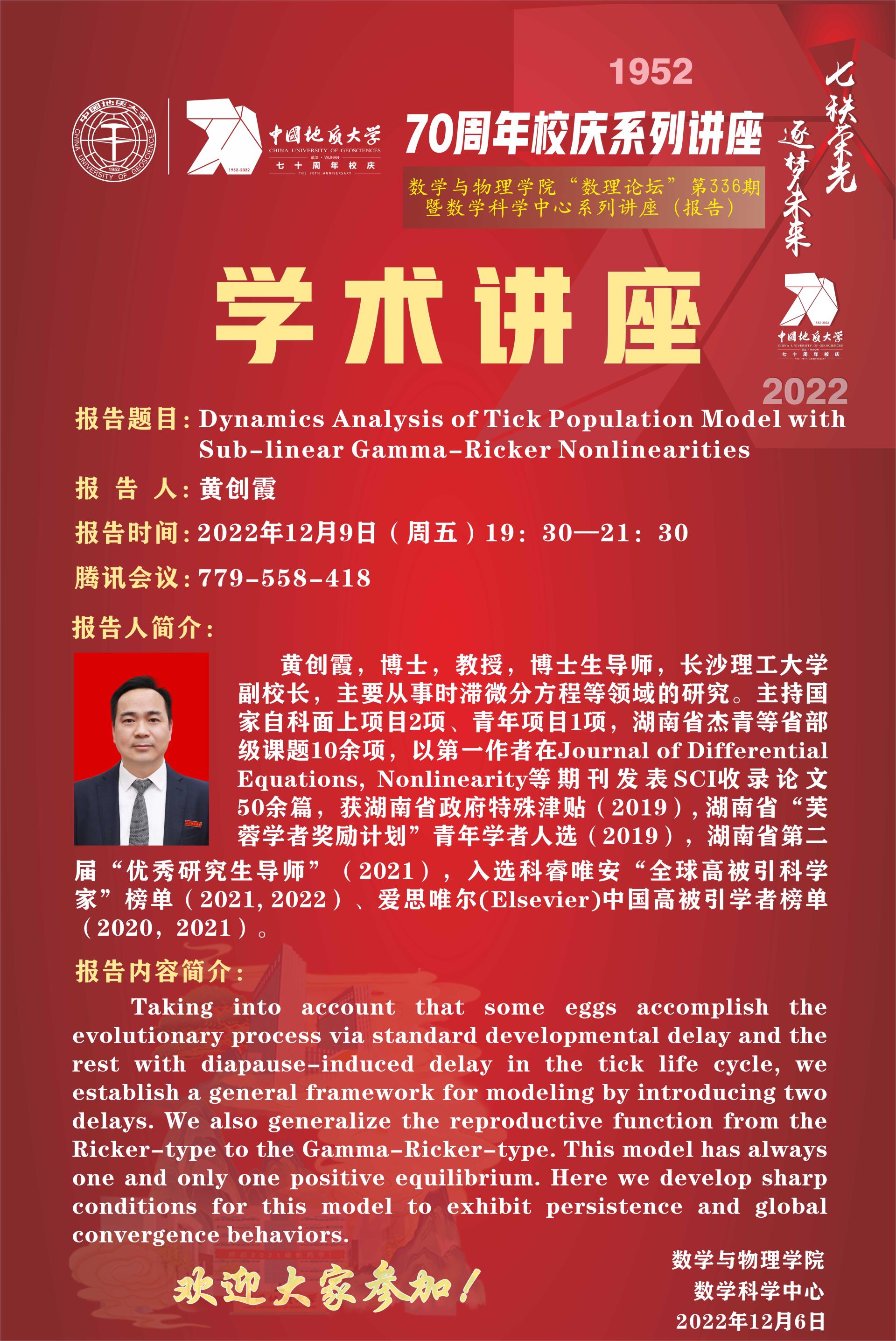 "数理论坛"第336期暨数学科学中心系列讲座(报告):Dynamics Analysis of Tick Population Model with Sub-linear Gamma-Ricker Nonlinearities