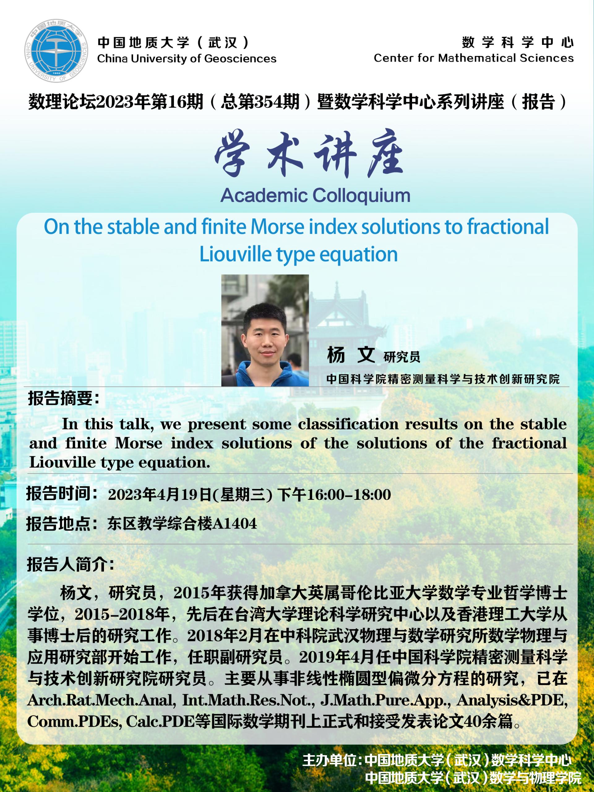 2023年4月19日杨文研究员学术讲座:On the stable and finite Morse index solutions to fractional Liouville type equation