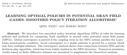 91网 信息与计算科学系教师汤庆博士为第一作者的学术研究工作 “Learning Optimal Policies in Potential Mean Field Games: Smoothed Policy Iteration Algorithms” ,最近发表在国际著名期刊SIAM Journal on Control and Optimization。该论文第二作者为91网 2020 级应用统计专业硕士生宋家豪。汤庆博士自2015年入职91网 ,主要从事动态博弈相关的偏微分方程理论、数值计算及在经济模型中的应用研究。
