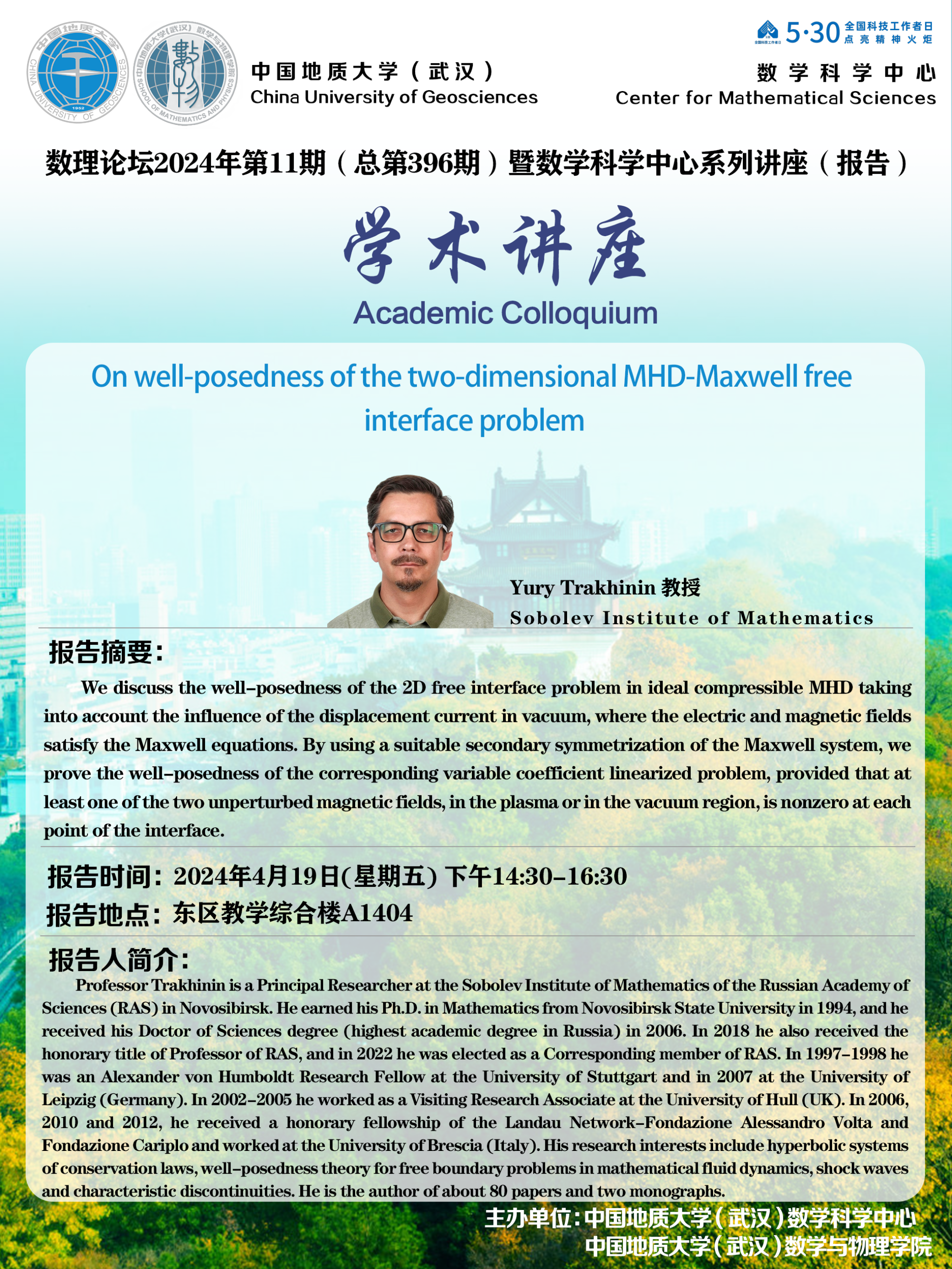 2024年4月19日Yury Trakhinin 院士学术讲座:On well-posedness of the two-dimensional MHD-Maxwell free interface problem