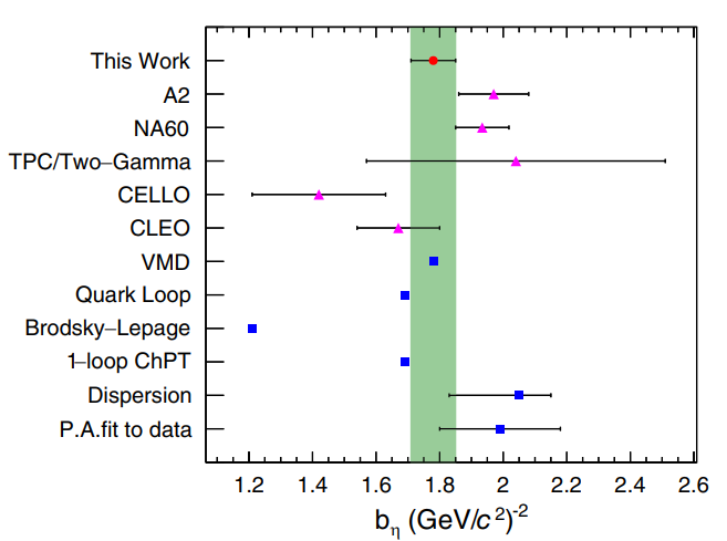 图1:η→γe+e−(左图)和η′→γe+e−(右图)跃迁形状因子的测量结果(红色的点)。粉色的点为其他实验组的测量结果,蓝色的点为不同理论计算的结果。