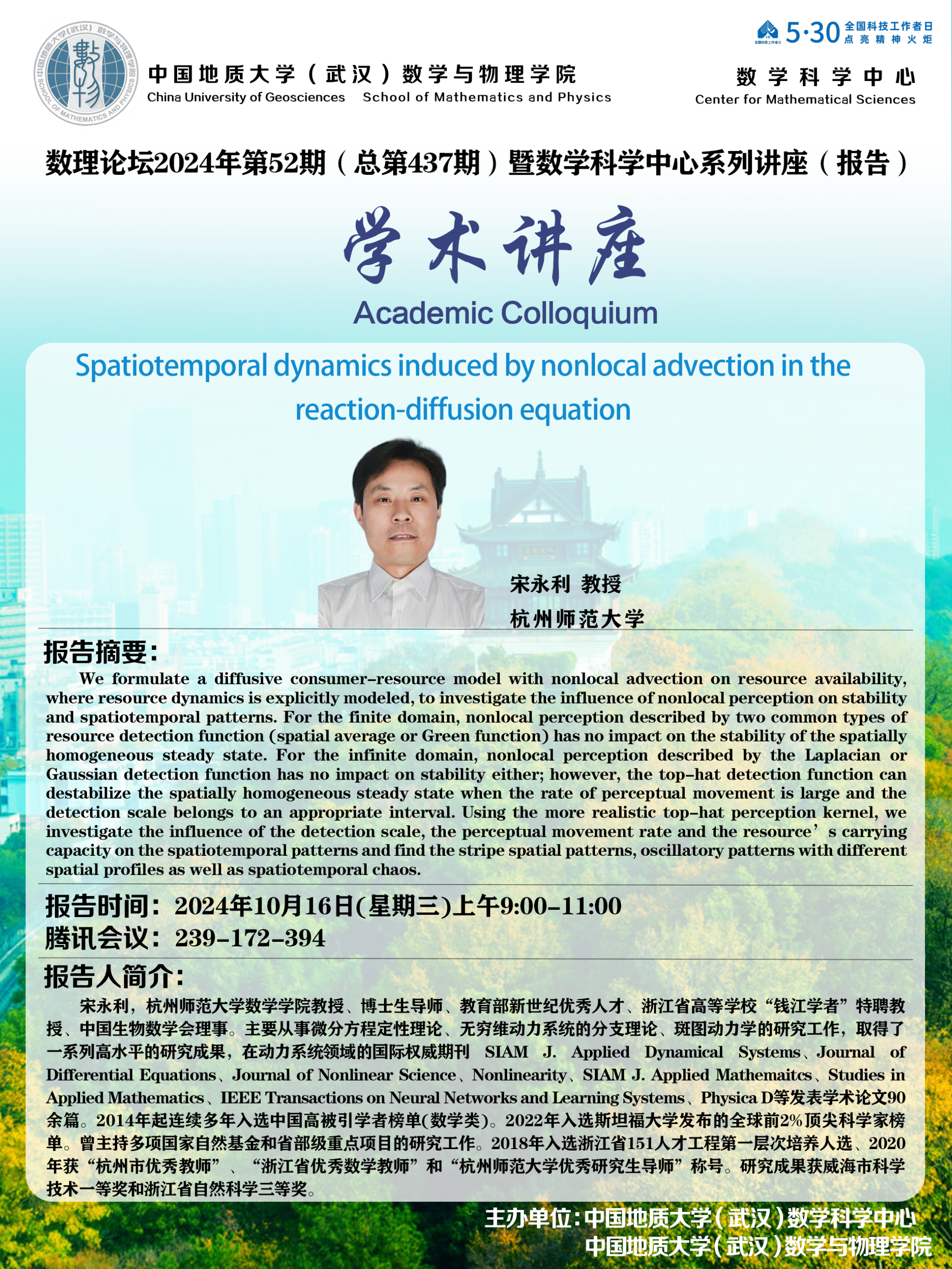 2024年10月16日宋永利教授学术讲座:Spatiotemporal dynamics induced by nonlocal advection in the reaction-diffusion equation