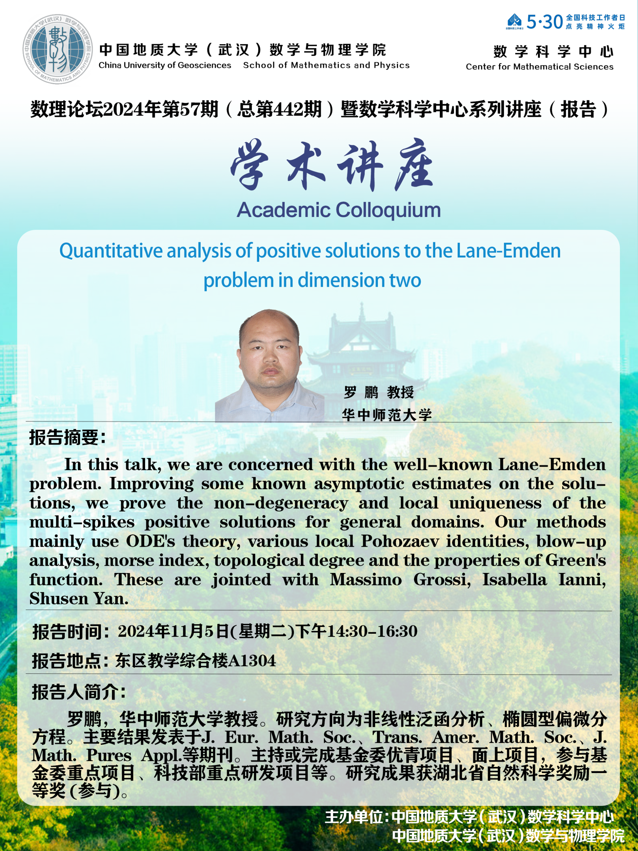 2024年11月5日罗鹏教授学术讲座:Quantitative analysis of positive solutions to the Lane-Emden problem in dimension two