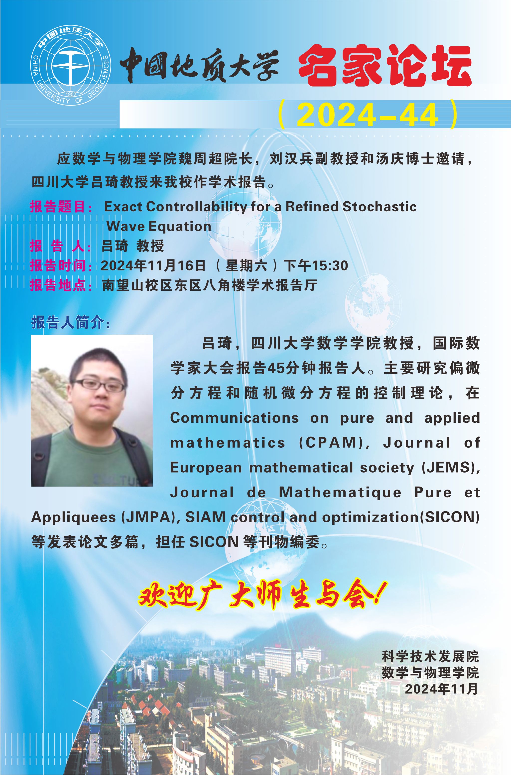 2024年11月16日吕琦教授学术讲座:Exact Controllability for a Refined Stochastic Wave Equation