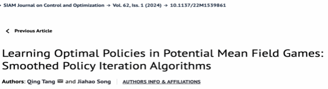 91网 信息与计算科学系教师汤庆博士作为通讯作者的工作 “Learning Equilibria in Cournot Mean Field Games of Controls” 最近发表于SIAM Journal on Control and Optimization。