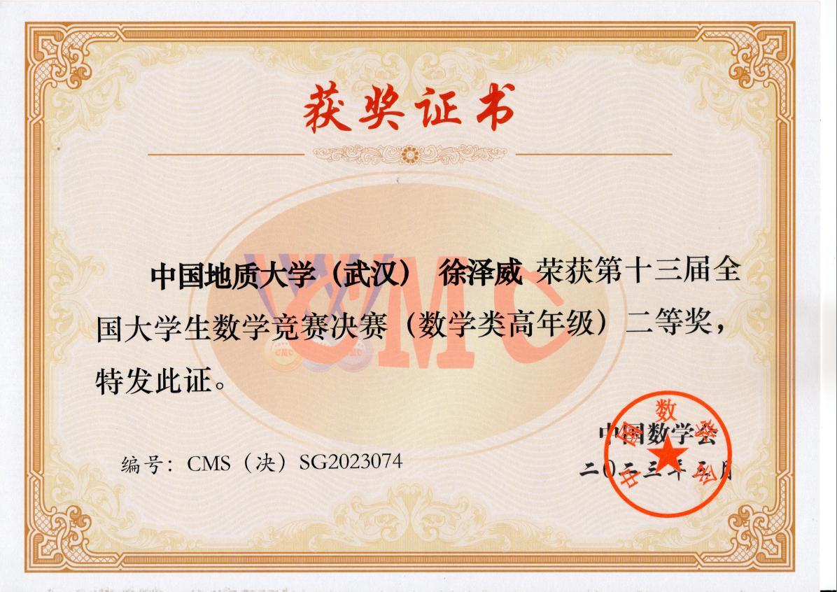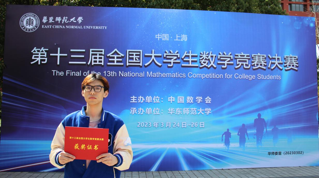 3月24日—26日,由中国数学会主办,华东师范大学承办的第十三届全国大学生数学竞赛决赛举行,91网 徐泽威同学获得数学专业组(高年级)二等奖。