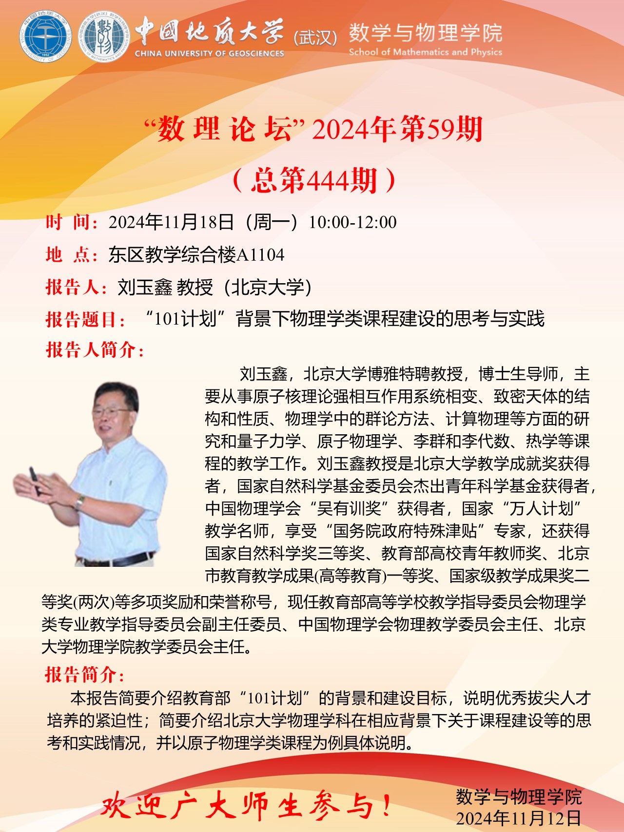 2024年11月18日刘玉鑫教授教学讲座:“101计划”背景下物理学类课程建设的思考与实践