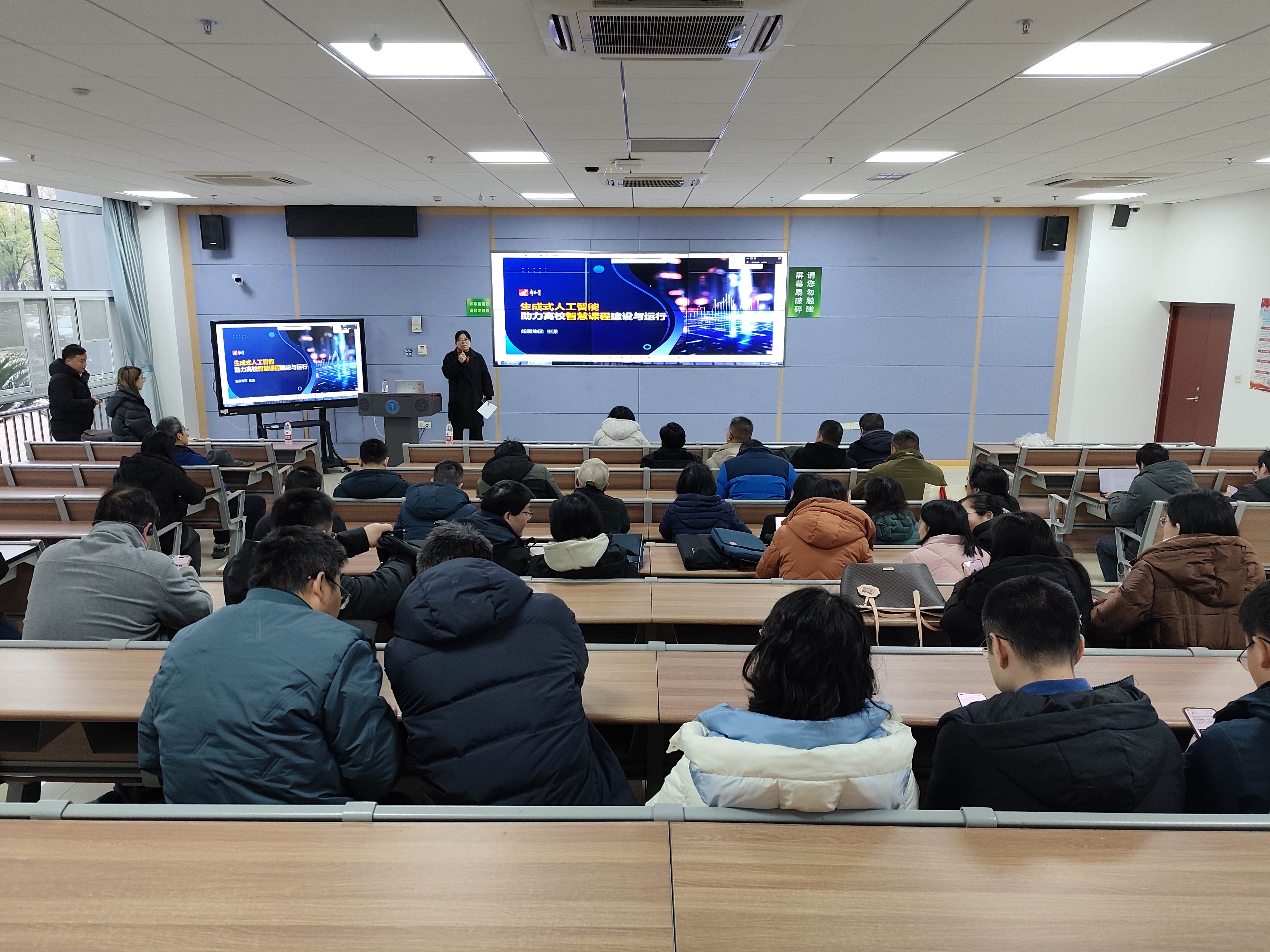 超星总部的高级产品经理王潇通过线上讲授的方式,给老师们介绍了关于“生成式人工智能助力高校智慧课程建设与运行”的精彩内容。王潇经理深入剖析知识图谱在专业建设中的应用原理,结合丰富的案例,展示了AI赋能教学如何为专业建设带来创新变革,让教师们对人工智能助力高校智慧课程有了更为深入和清晰的理解,为后续在教学中的应用奠定了理论基础。