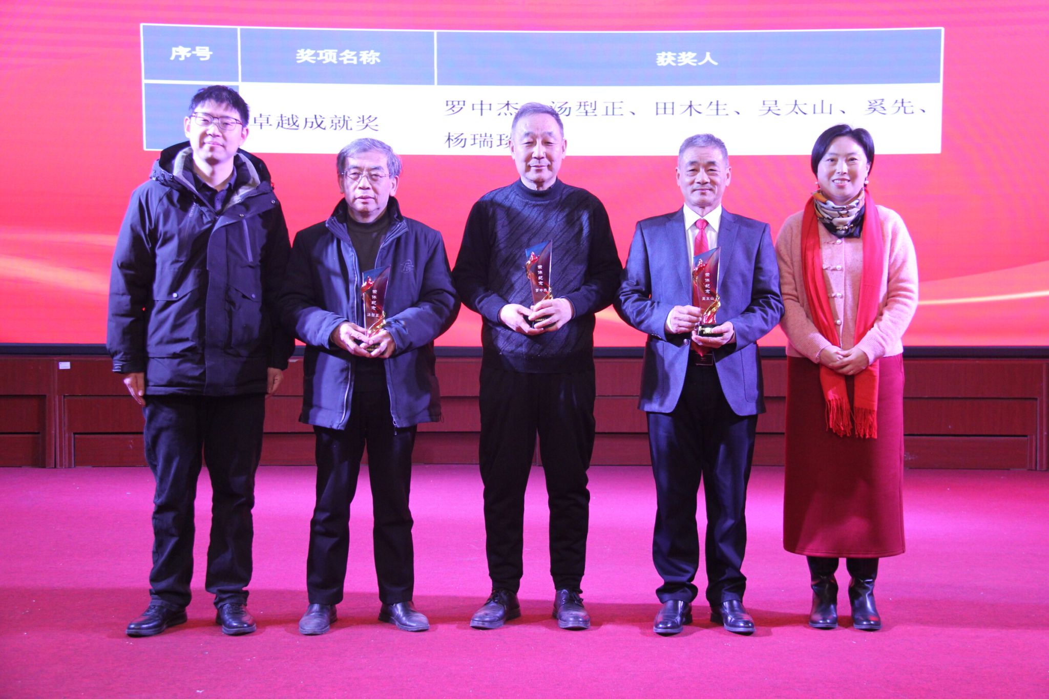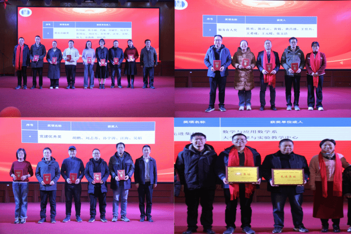 第二阶段,是以 “共话学院情,同启新征程” 为主题的年度表彰和茶话会活动。该阶段由王希成主持,旨在表彰2024年度在学院党建、教学、科研、服务育人、工会活动等方面表现突出的先进集体和优秀个人。学院特别为2024年光荣退休的罗中杰、汤型正、田木生、吴太山、奚先、杨瑞琰等六位老师举办了温馨的荣休仪式,书记、院长为他们颁发了“卓越成就奖”纪念奖杯,代表全院师生对六位荣休教师多年来倾心奉献、辛勤耕耘表达诚挚感谢。荣休教师代表吴太山老师发表感言,他对学院在学科专业建设上取得的突破性进展表示热烈祝贺,对学院给予荣休教师的关怀表达了深深感激,并深情承诺退休后仍将心系学院,持续关注和支持学院的发展。