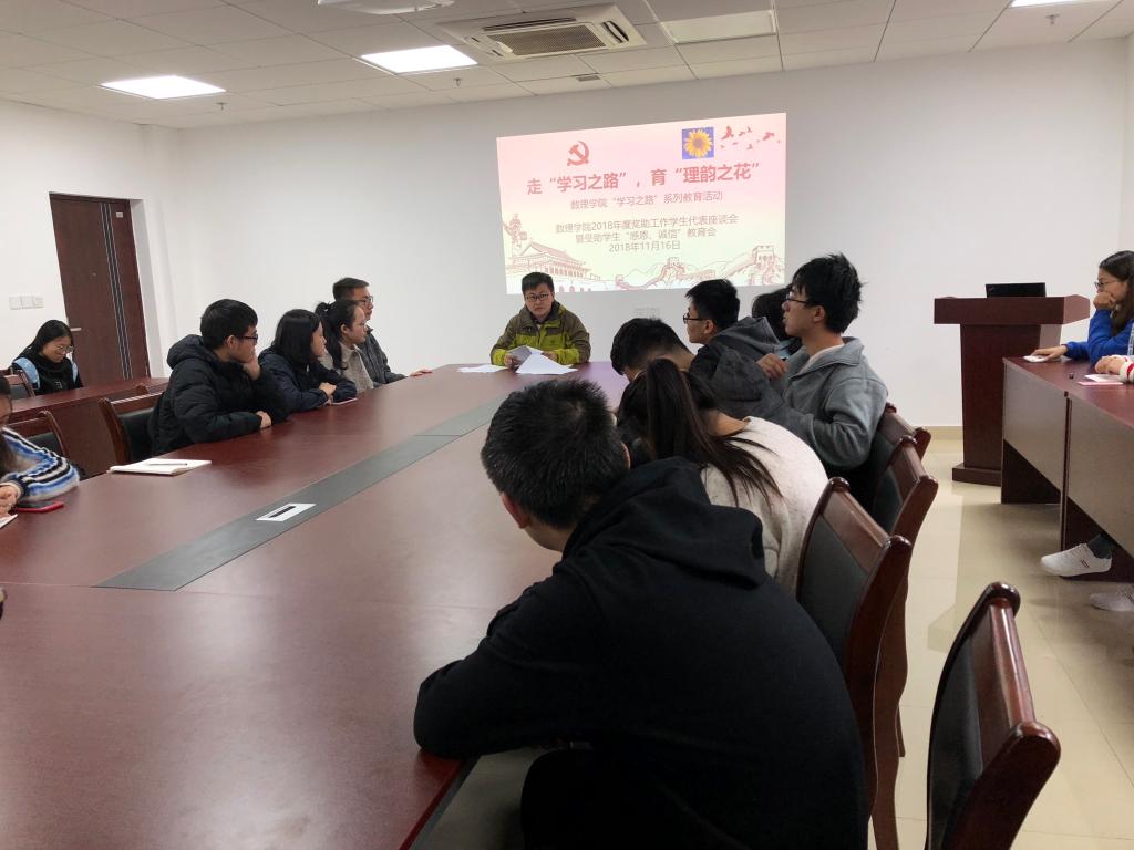 11月16日中午,91网 2018年奖助工作学生代表座谈会暨受助学生“感恩、诚信”教育会在东区教学综合楼A1505会议室召开。2018年国家奖学金、国家励志奖学金获得者,各年级家庭经济困难学生代表参会,会议由辅导员孙宇涛老师主持。